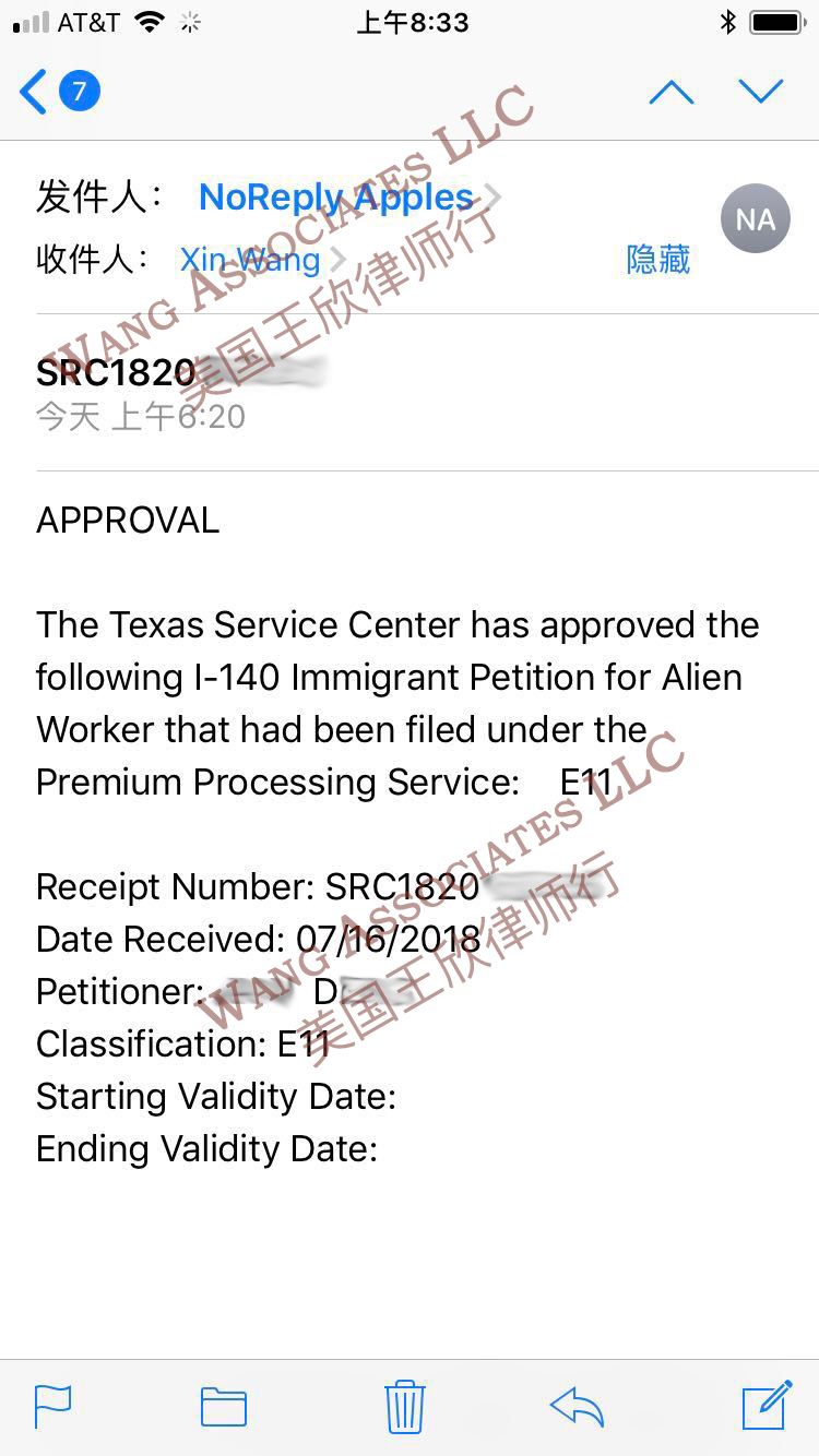 (D先生移民局批复邮件,版权归美国王欣律师行所有,盗图必究)