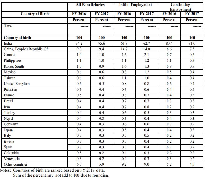 2016财年和2017财年审批的H-1B申请中,印度受益人占74.2%和75.6%,遥遥领先其他各国。